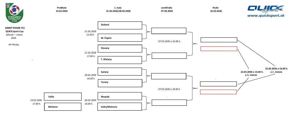 V mesiacoch február – marec 2026 sa uskutoční na hracej ploche Pltníky Zimný pohár TFZ QUICK Sport Cup. Do turnaja sa prihlásilo 9 účastníkov – Belá-Dulice „B“ (Necpaly), Dubové, M. Čepčín, Mošovce, Slovany, Sučany, Turany, T. Kľačany, Valča. Z toho dôvodu sa uskutoční 1 zápas v rámci predkola.