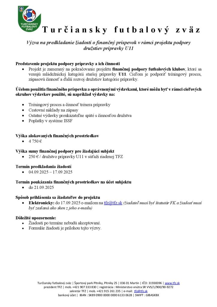 Výkonný výbor TFZ na svojom zasadnutí dňa 21.08.2025 schválil výzvu na predkladanie žiadosti o finančný príspevok v rámci projektu podpory mládežníckych družstiev pre kategórie U09 a U13.