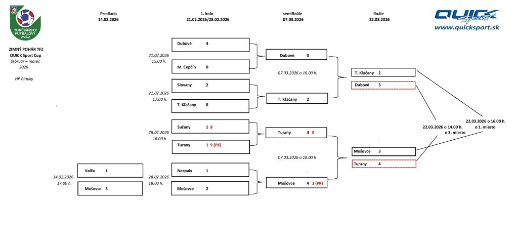V mesiacoch február – marec 2026 sa uskutoční na hracej ploche Pltníky Zimný pohár TFZ QUICK Sport Cup. Do turnaja sa prihlásilo 9 účastníkov – Belá-Dulice „B“ (Necpaly), Dubové, M. Čepčín, Mošovce, Slovany, Sučany, Turany, T. Kľačany, Valča. Z toho dôvodu sa uskutoční 1 zápas v rámci predkola.